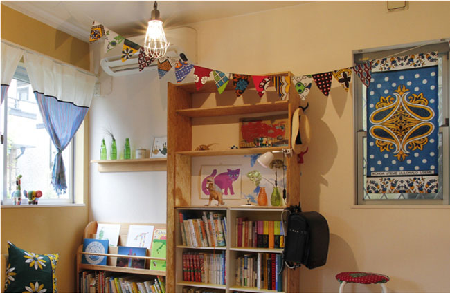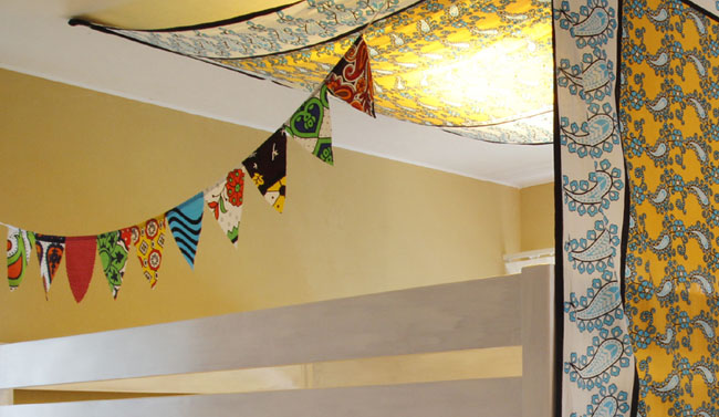 他の布のガーランドと比べると、カンガの鮮やかさが際立つアイテムです。