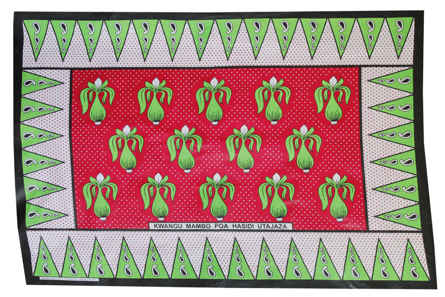民族布 Kanga ( カンガ ) 。独特の色と柄、一枚一枚にセイイングと呼ばれるメッセージが書かれているのが特徴です。