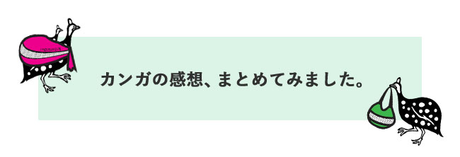 わたしはアフリカのテキスタイルがとても好きなのですが、東アフリカのもの(つまり代表的なものとしてカンガ)は持っていませんでした。以前たまたまカティカティさんのことを人から聞きウェブサイトを拝見したところ、非常に種類が豊富で素敵な図柄が多く、それに取り扱いの注意なども丁寧に記されていて、たいへん印象深く思っておりました。また、アフリカへの支援の姿勢についても感銘を受けました。